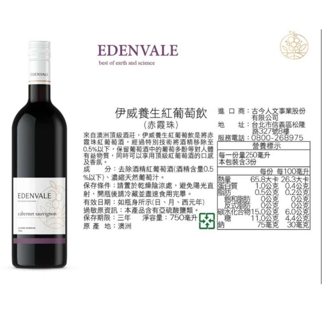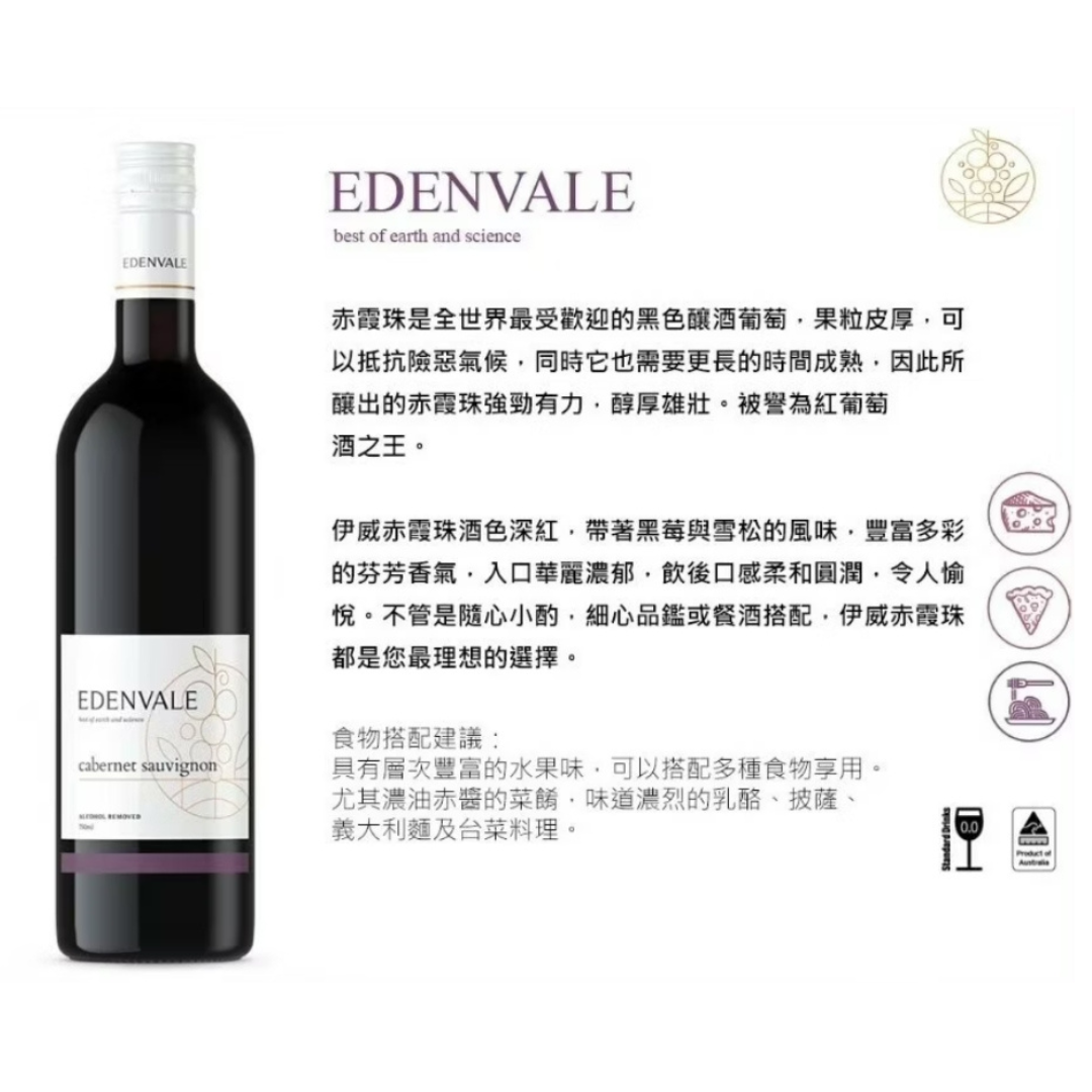 ◆來自澳洲的 Edenvale Cabernet Sauvignon,忠實呈現傳統卡本內蘇維濃的風味結構,保有紅酒靈魂,卻零酒精、無負擔。