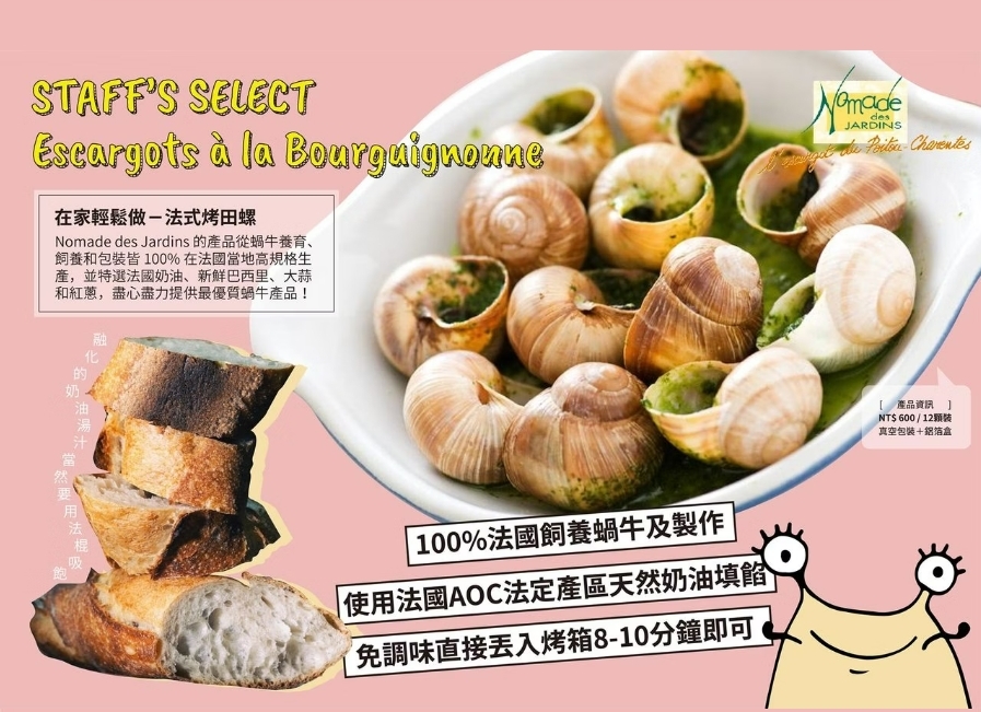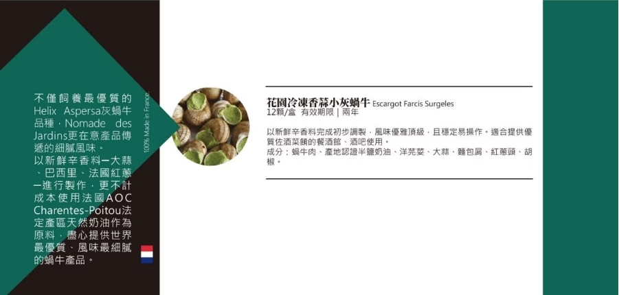 ◆100% 產自法國高等級小灰蝸牛,使用巴西里、大蒜、紅蔥和法國 AOC Charentes Poitou奶油完美比例調味