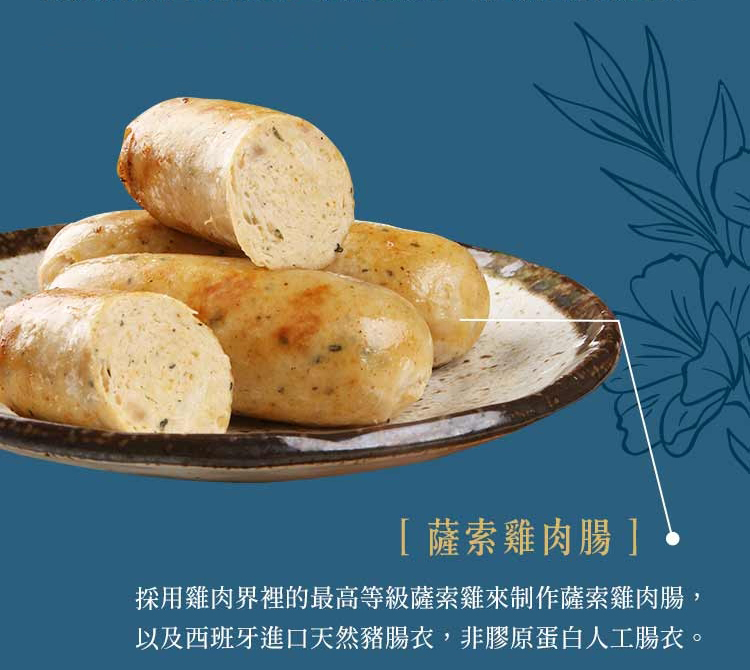 ◆採用雞肉界裡的最高等級薩索雞來制作薩索雞肉腸,師承歐洲德國與瑞士人的打漿手法,選用百分百的雲林薩索雞,無添加大豆填充粉
