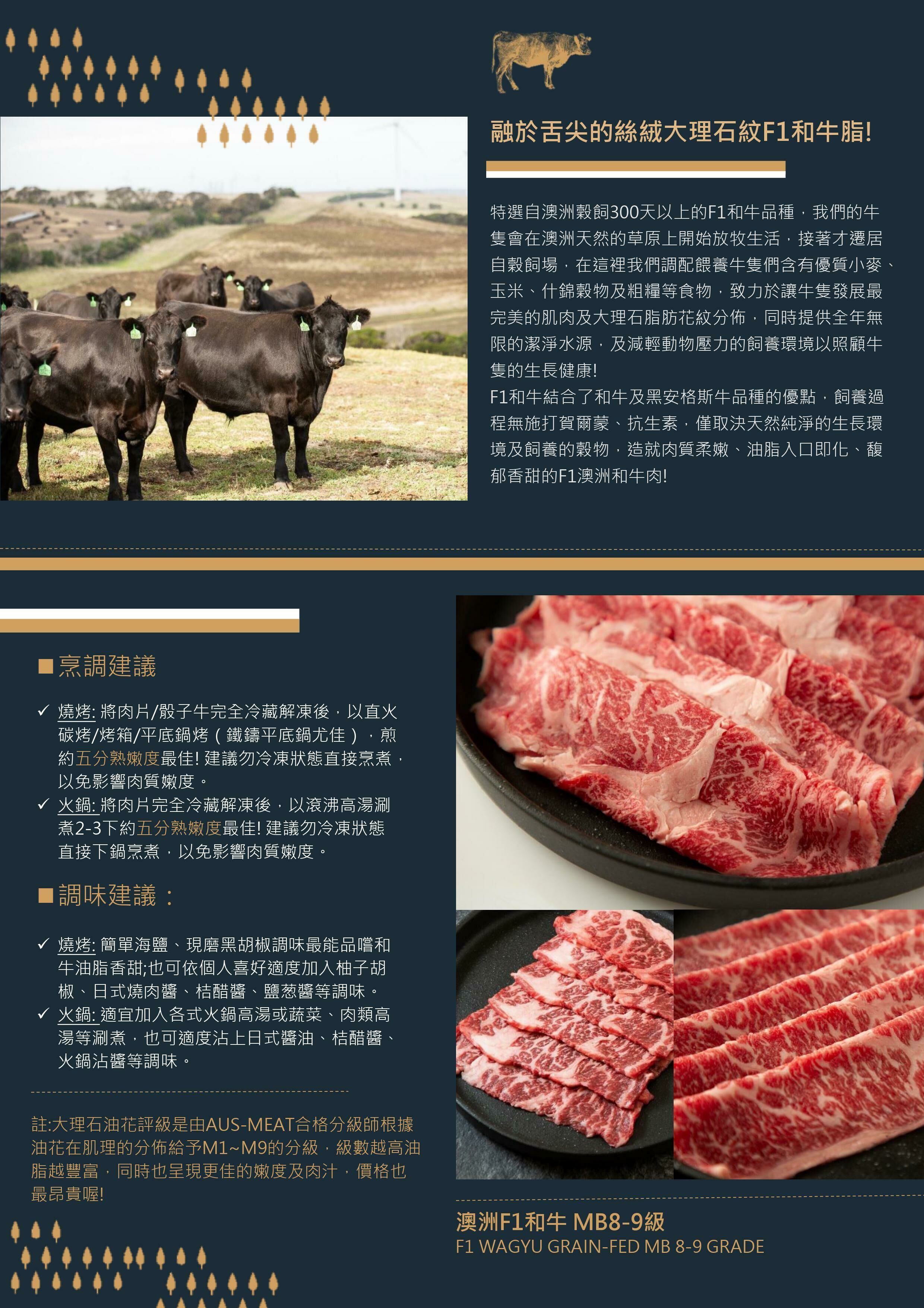 ◆大理石油花評級是由AUS-MEAT合格分級師根據油花在肌理的分佈給予M1~M9的分級,級數越高油脂越豐富,同時也能呈現更佳的嫩度及肉汁,價格也越昂貴喔!