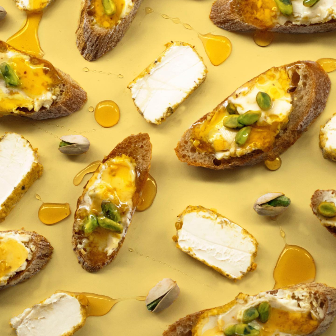 全脂軟乾酪[巴氏殺菌牛奶、乳脂(牛奶)、鹽、黏稠劑(刺槐豆膠、關華豆膠)、乳酸菌]、蜂蜜、烤開心果、防腐劑(己二烯酸)