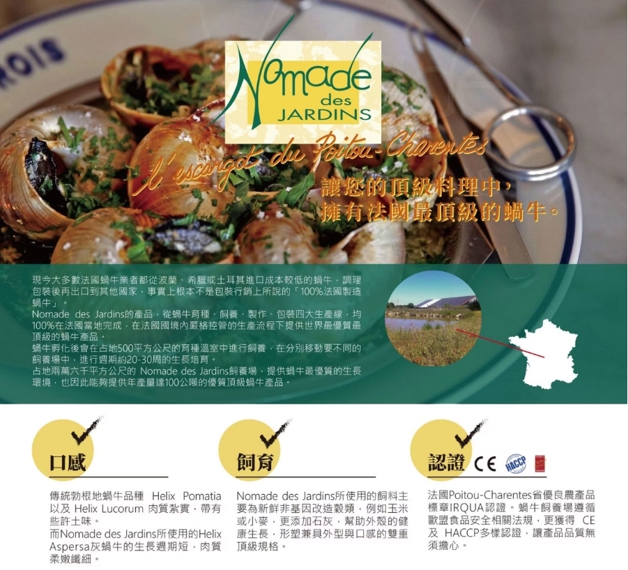 品名:Nomade des Jardins 法國酥皮香蒜大灰蝸牛(法式田螺) 12顆