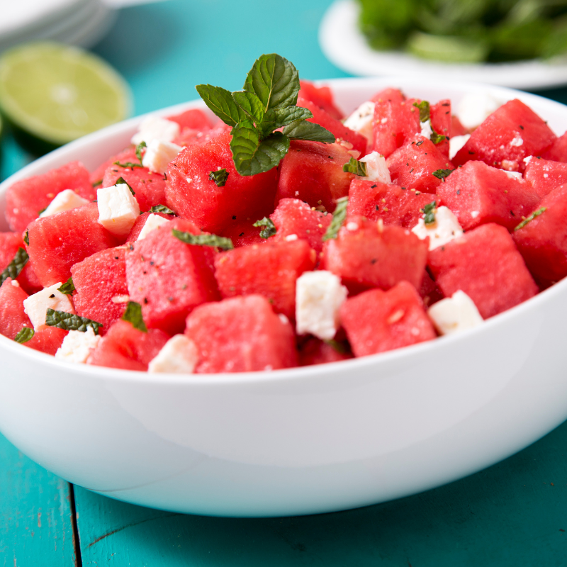 - 把切成塊的西瓜、費塔乾酪、薄荷葉放在一起。